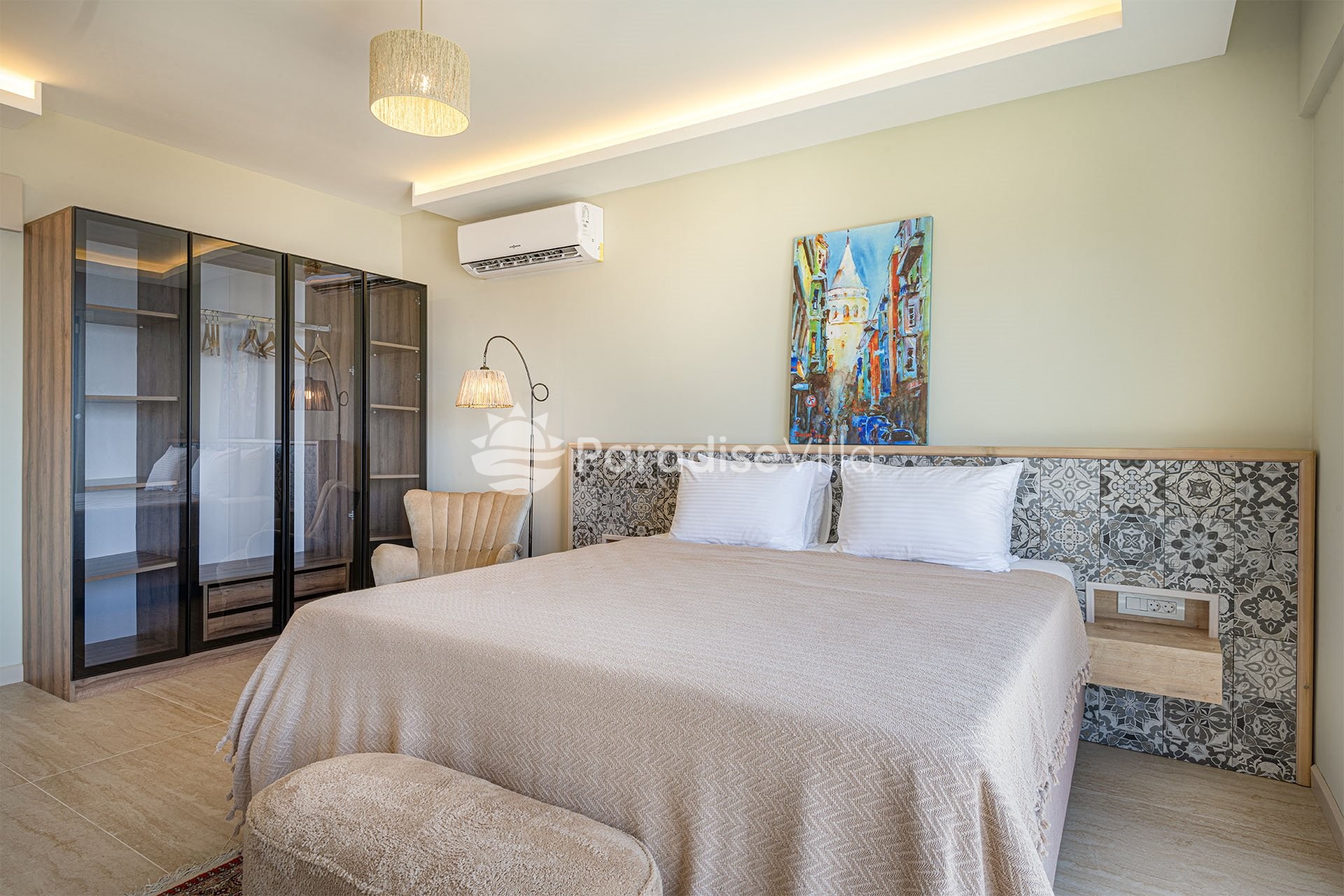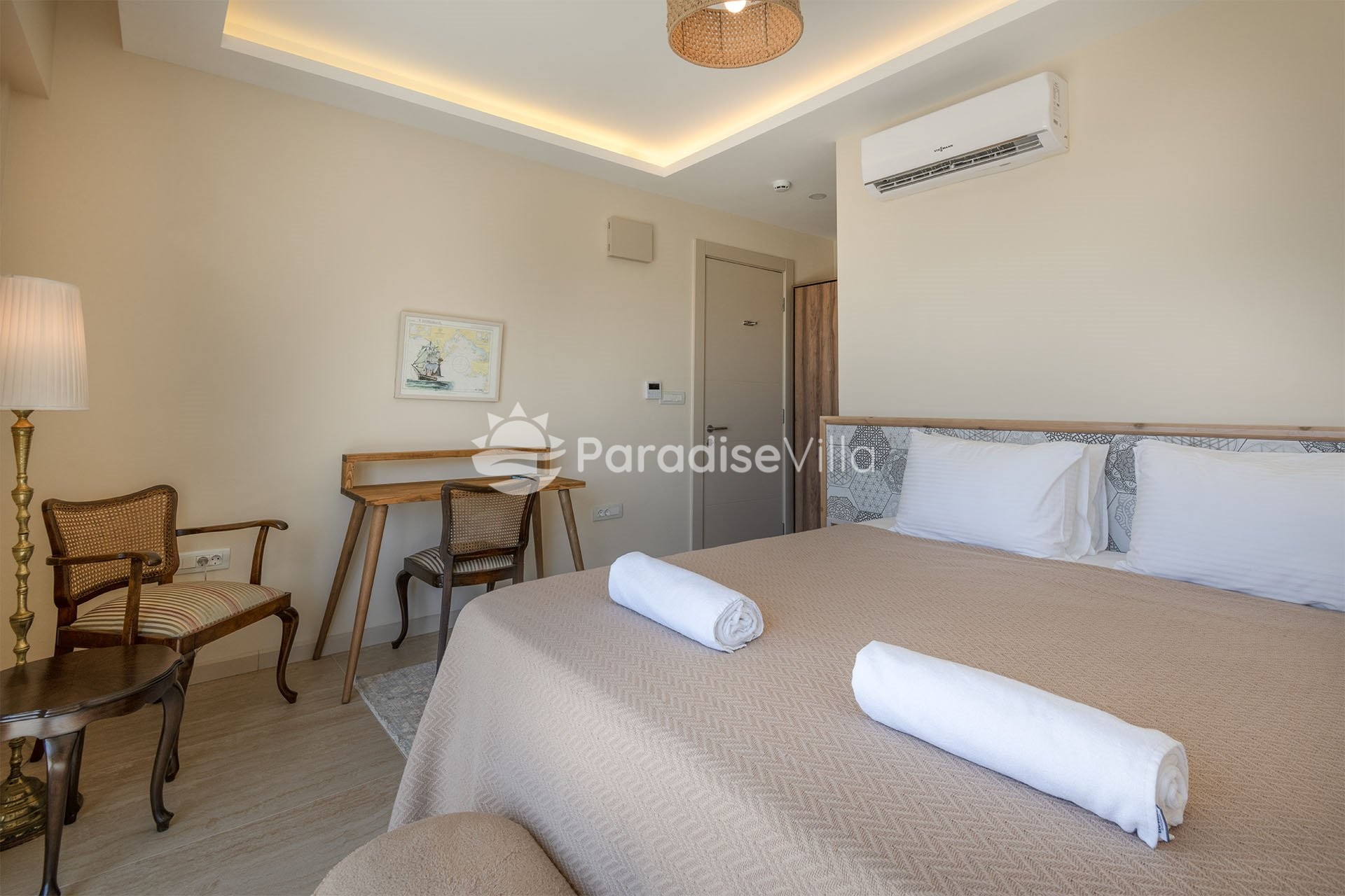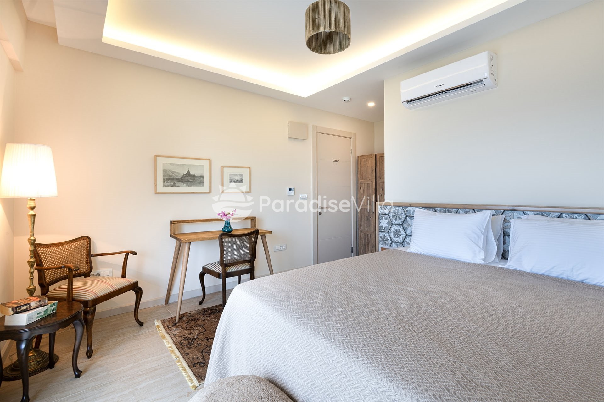 1. Yatak Odası: 1 çift kişilik yatak, elbise dolabı, komodin, klima, banyo, makyaj masası