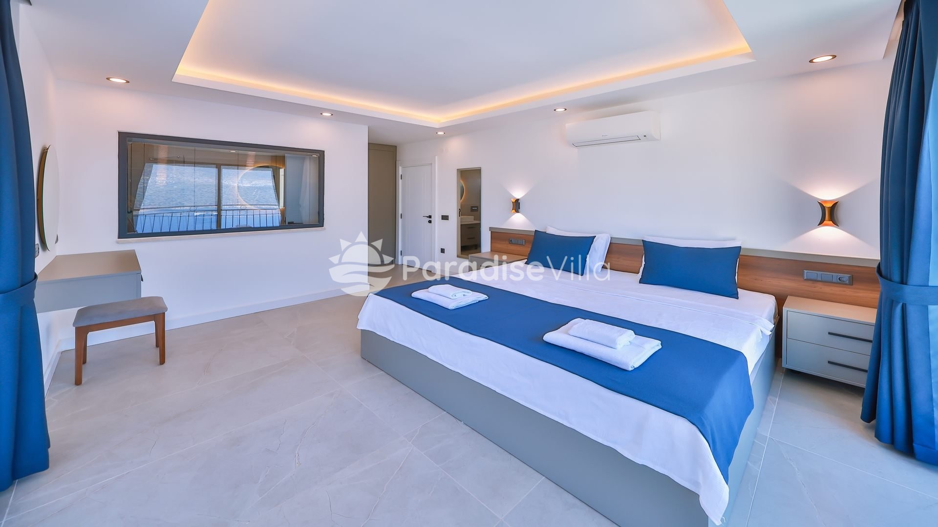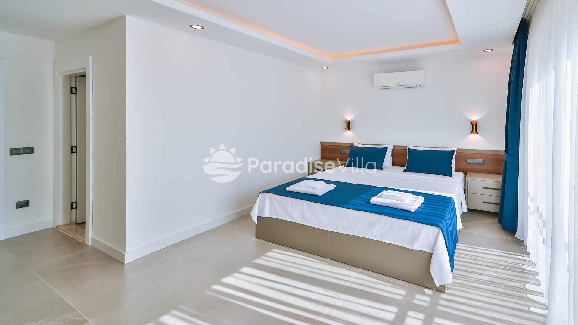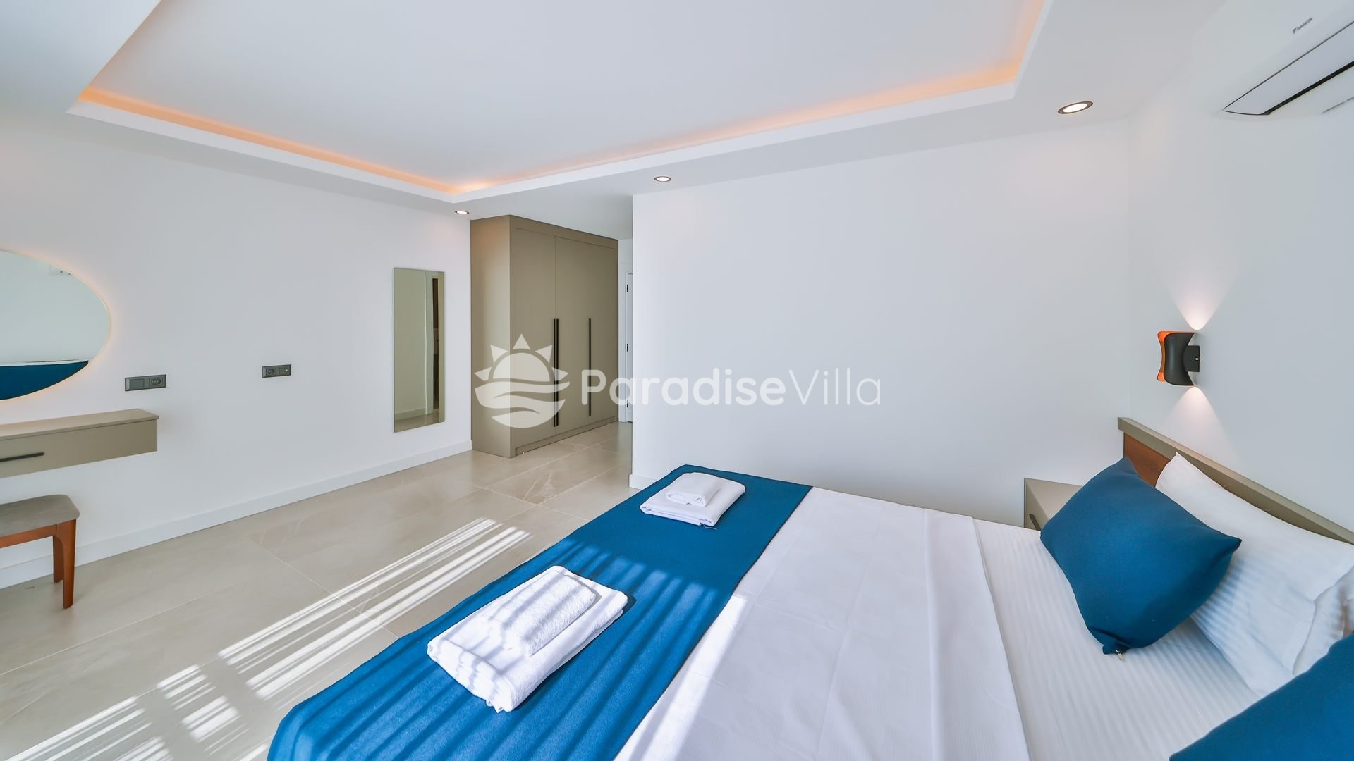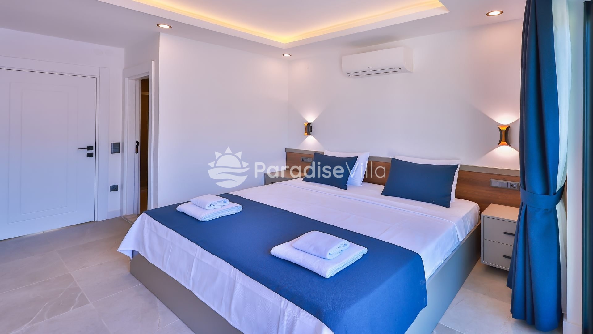 1. Yatak Odası: 1 çift kişilik yatak, elbise dolabı, komidin, klima, banyo