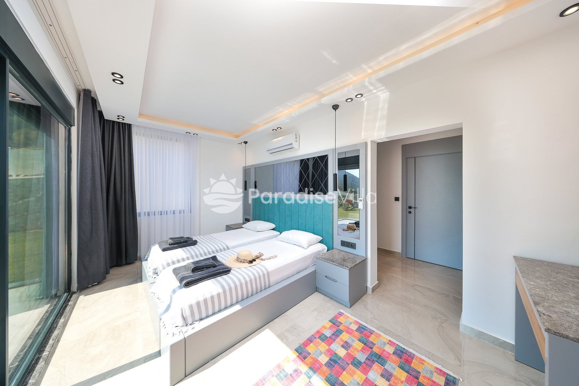 1. Yatak Odası: 2 tek kişilik yatak, elbise dolabı, komodin, klima, banyo (alt katta)