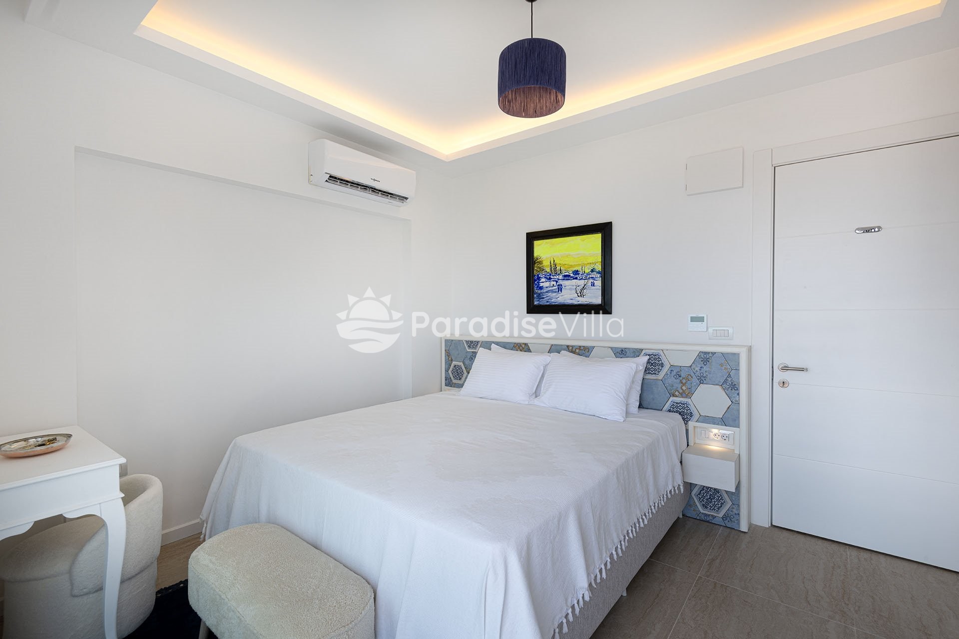 1. Yatak Odası: 1 çift kişilik yatak, elbise dolabı, komodin, klima, banyo