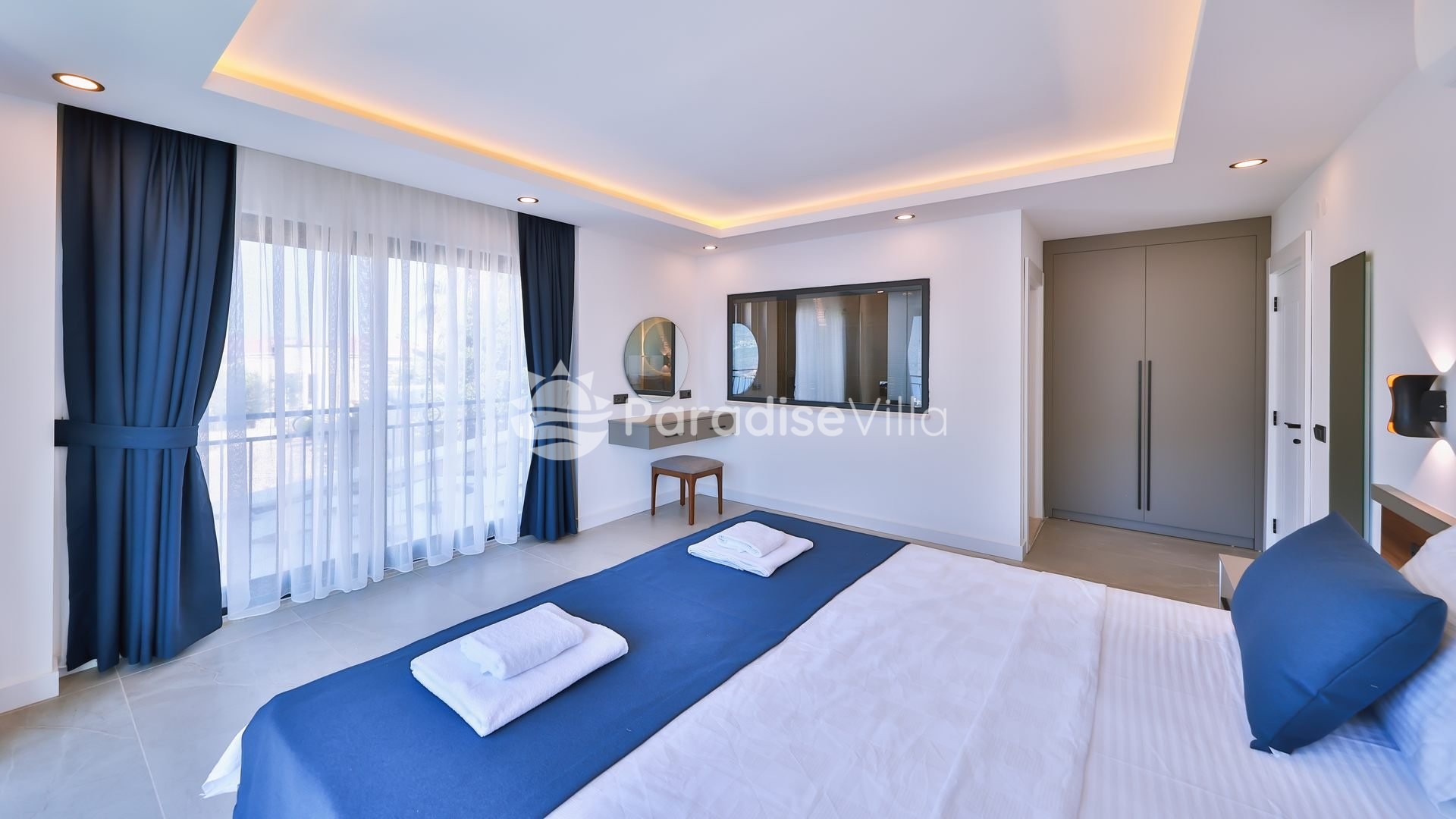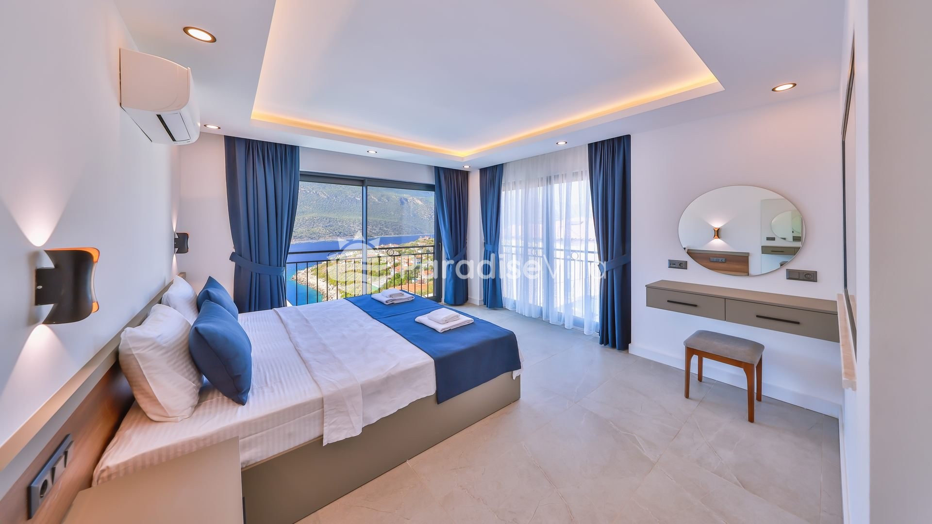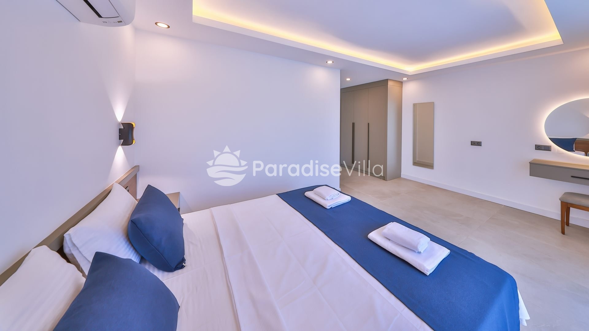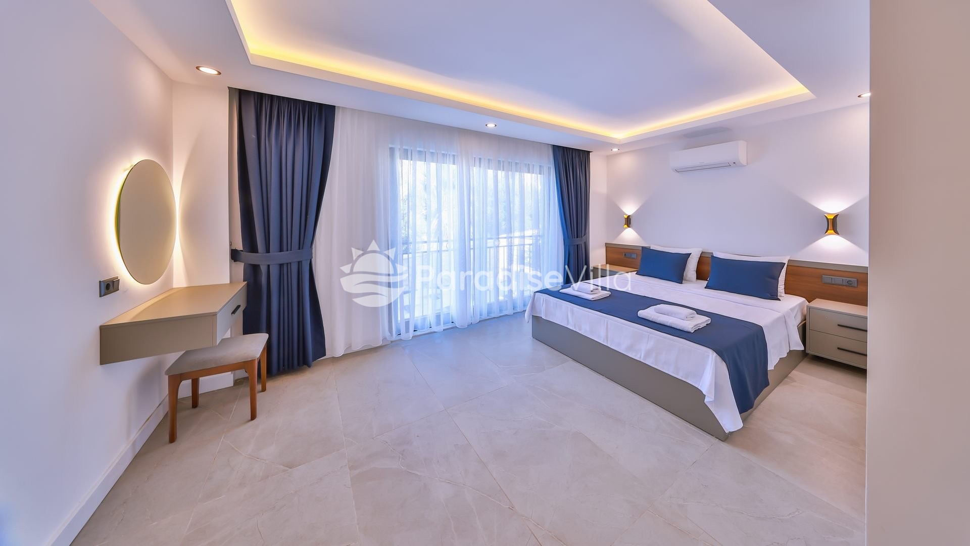1. Yatak Odası: 1 çift kişilik yatak, elbise dolabı, komidin, klima, banyo