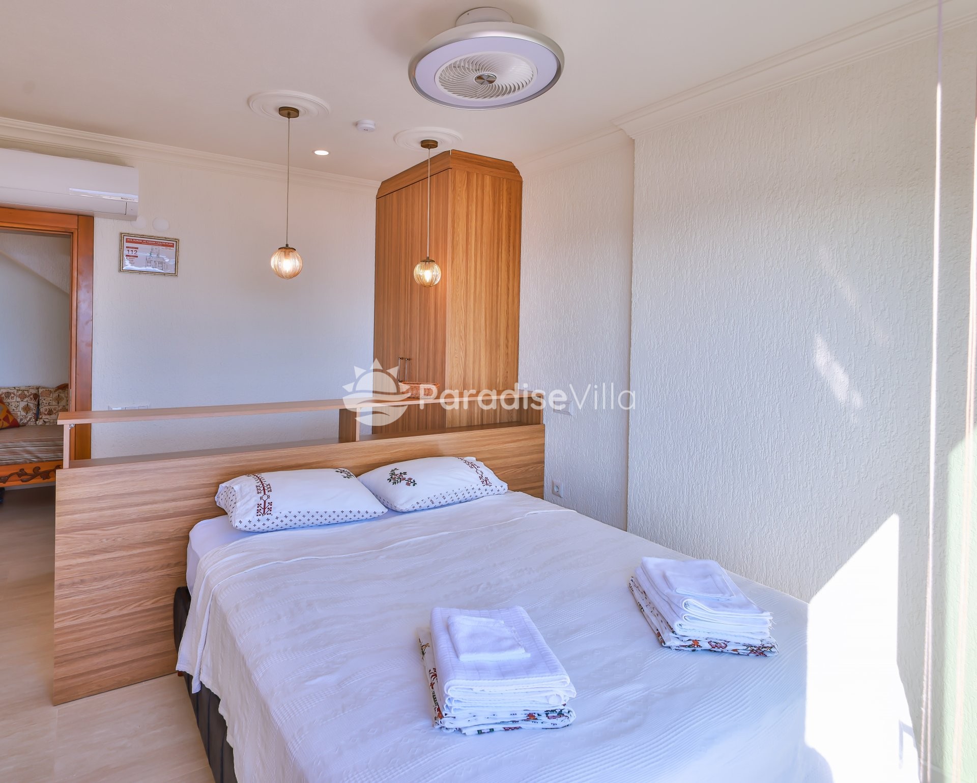 3. Yatak Odası: 1 çift kişilik yatak, elbise dolabı, komodin, klima, ortak banyo