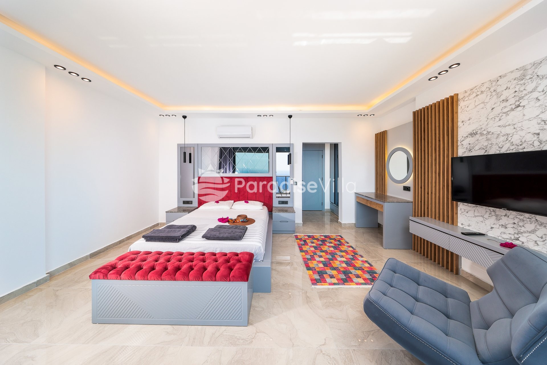 3. Yatak Odası: 1 çift kişilik yatak, elbise dolabı, komodin, klima, banyo (orta katta)