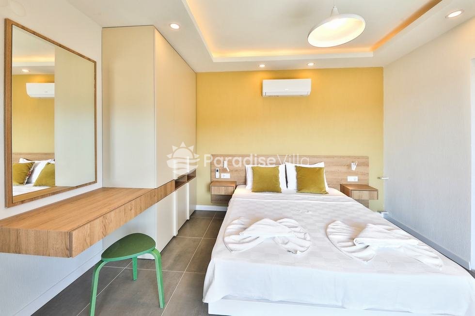 1. Yatak Odası: 1 çift kişilik yatak, elbise dolabı, komidin, klima, banyo