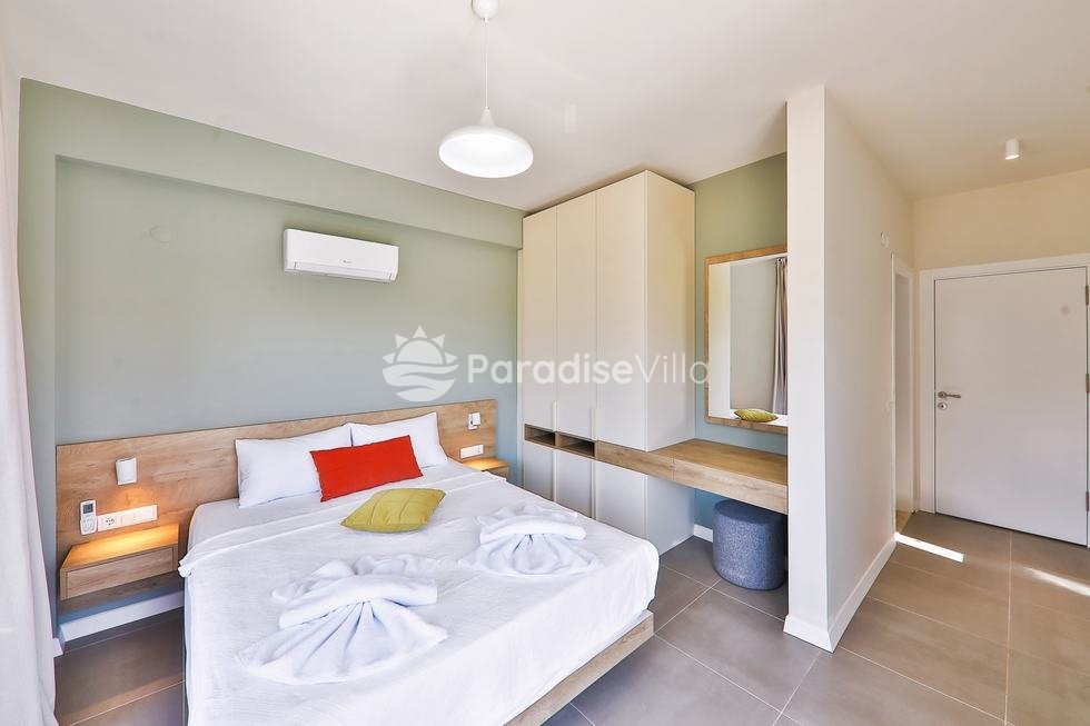 1. Yatak Odası: 1 çift kişilik yatak, elbise dolabı, komidin, klima, banyo